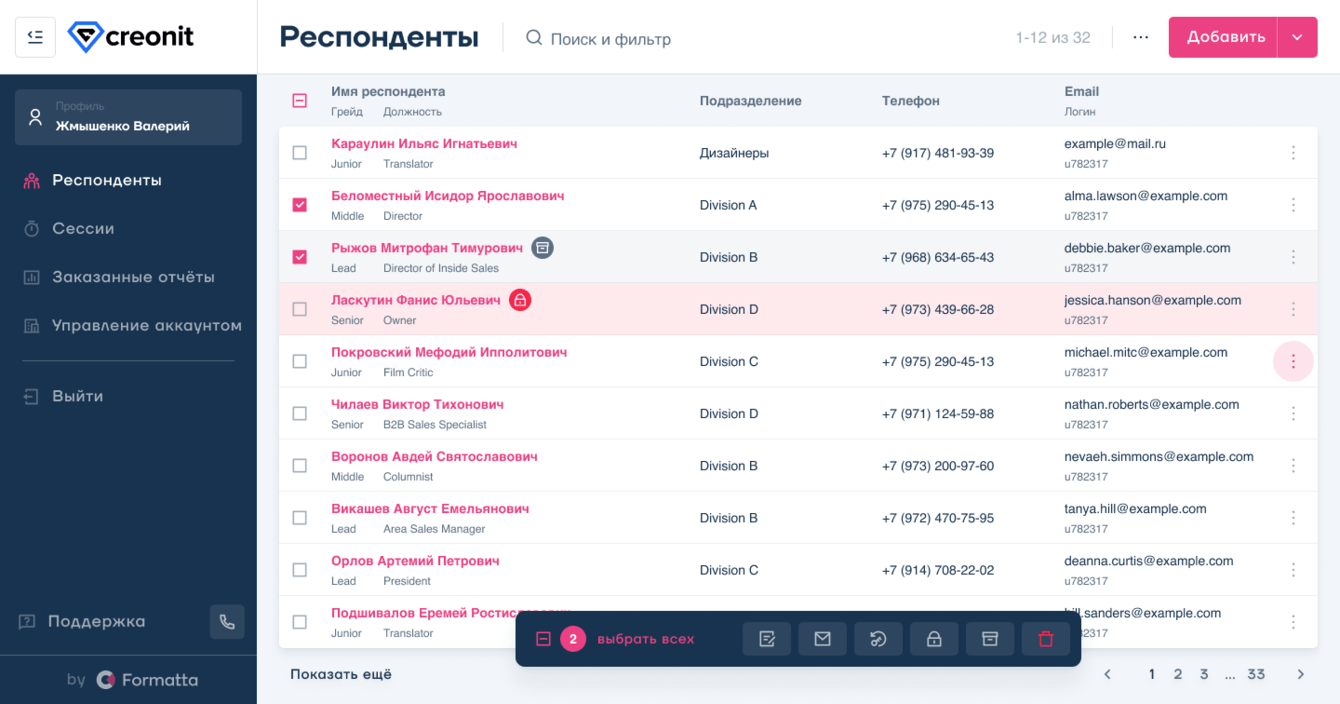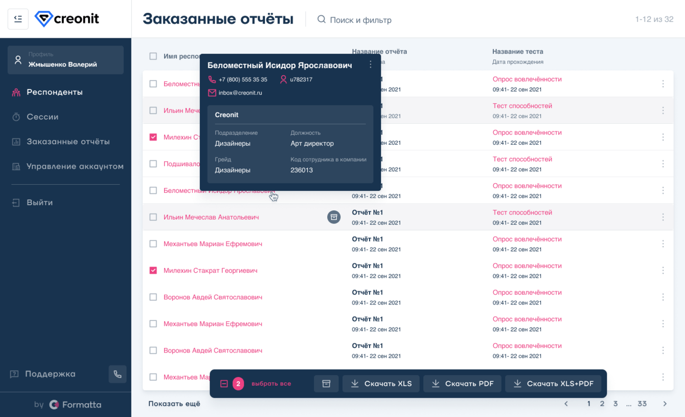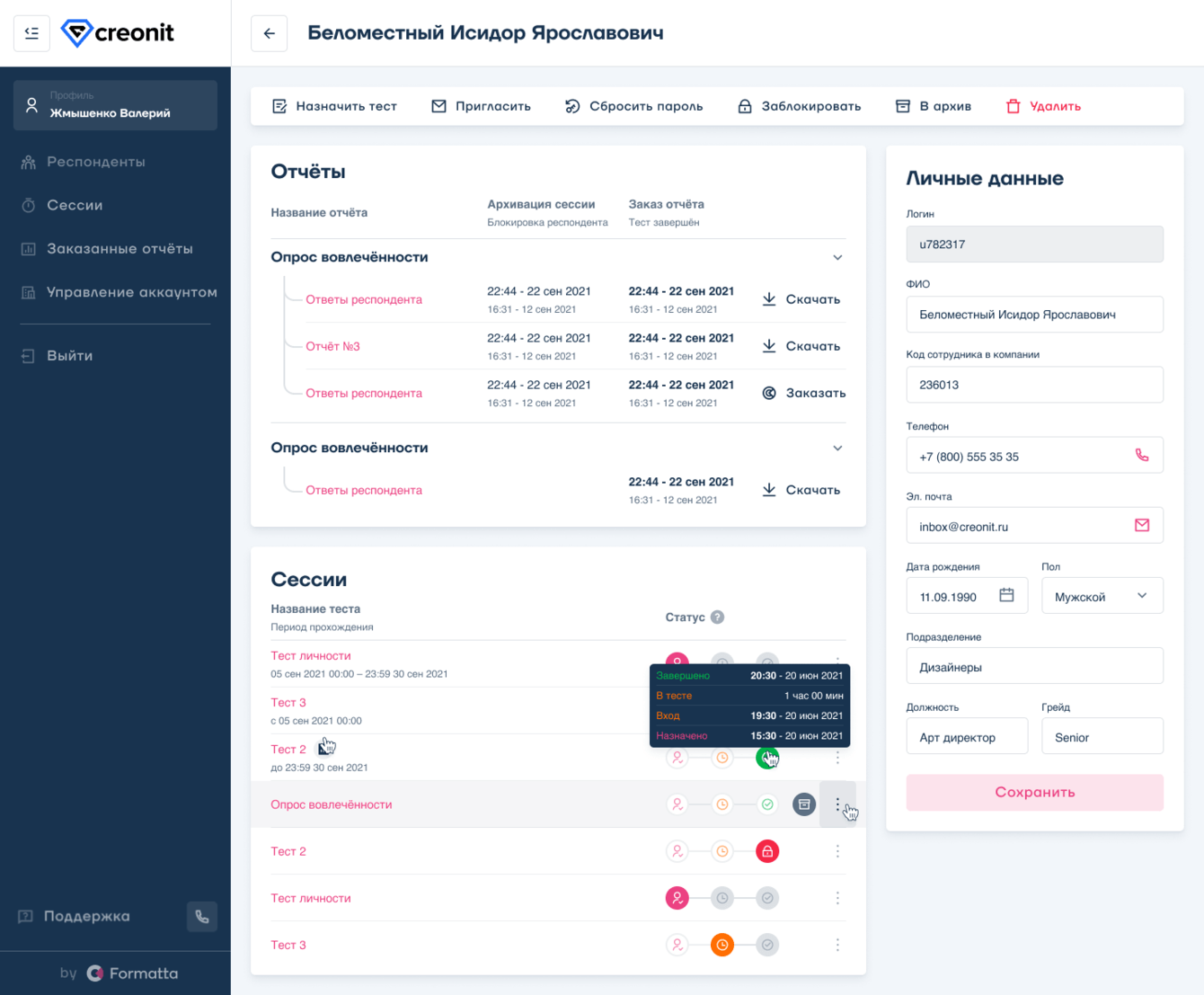 Личный кабинет позволяет клиентам Formatta управлять компанией, респондентами и тестами. Есть функциональность массового изменения респондентов, сессий и отчётов.