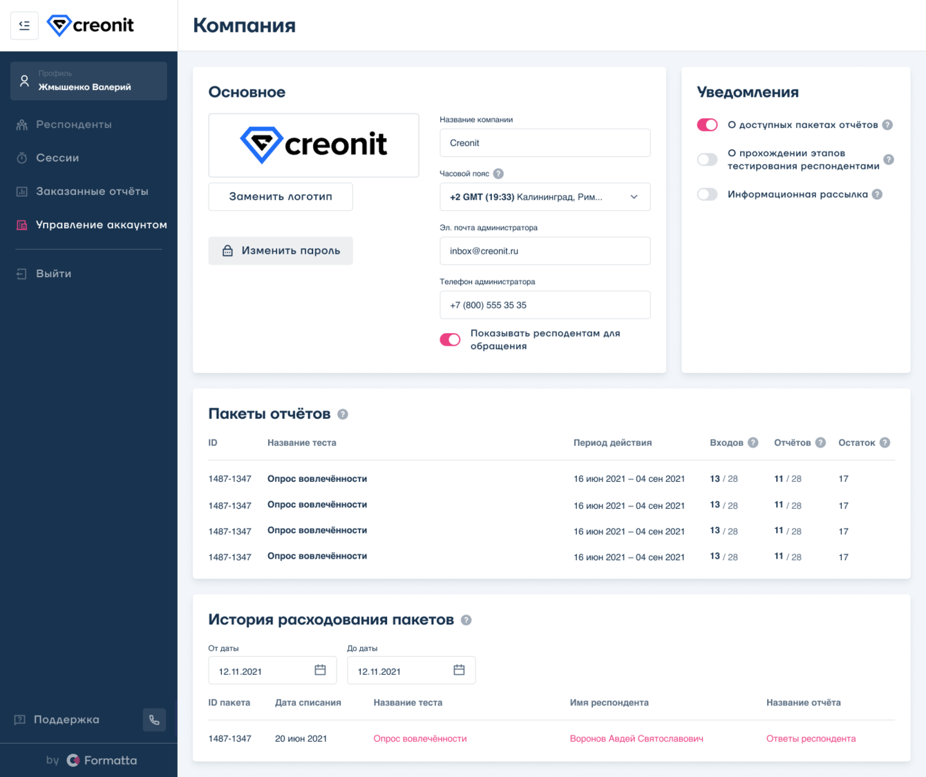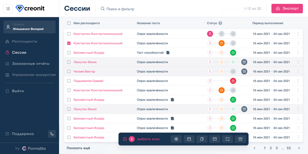 Личный кабинет позволяет клиентам Formatta управлять компанией, респондентами и тестами. Есть функциональность массового изменения респондентов, сессий и отчётов.