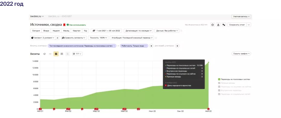Совокупность ссылок на других ресурсах (внешние сайты, соцсети), которые ведут на сайт bwclinic.ru, и есть его ссылочная масса. Это важный фактор: чем больше авторитетных источников ссылается на страницу, тем выше она поднимается в позициях выдачи Google и Яндекса. Именно поэтому после оценки ссылочной массы мы разработали дальнейшую стратегию по ее развитию и начали работы в соответствии с этим планом.
