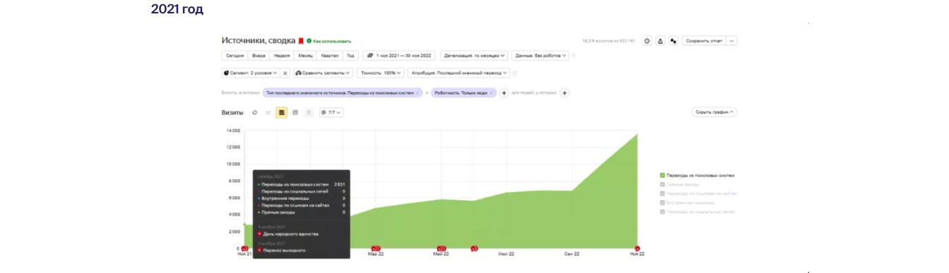 Анализируя статистику переходов за год с 11.2021 по 11.2022 можно наблюдать стабильную среднюю посещаемость 80 человек в день из поисковых систем.