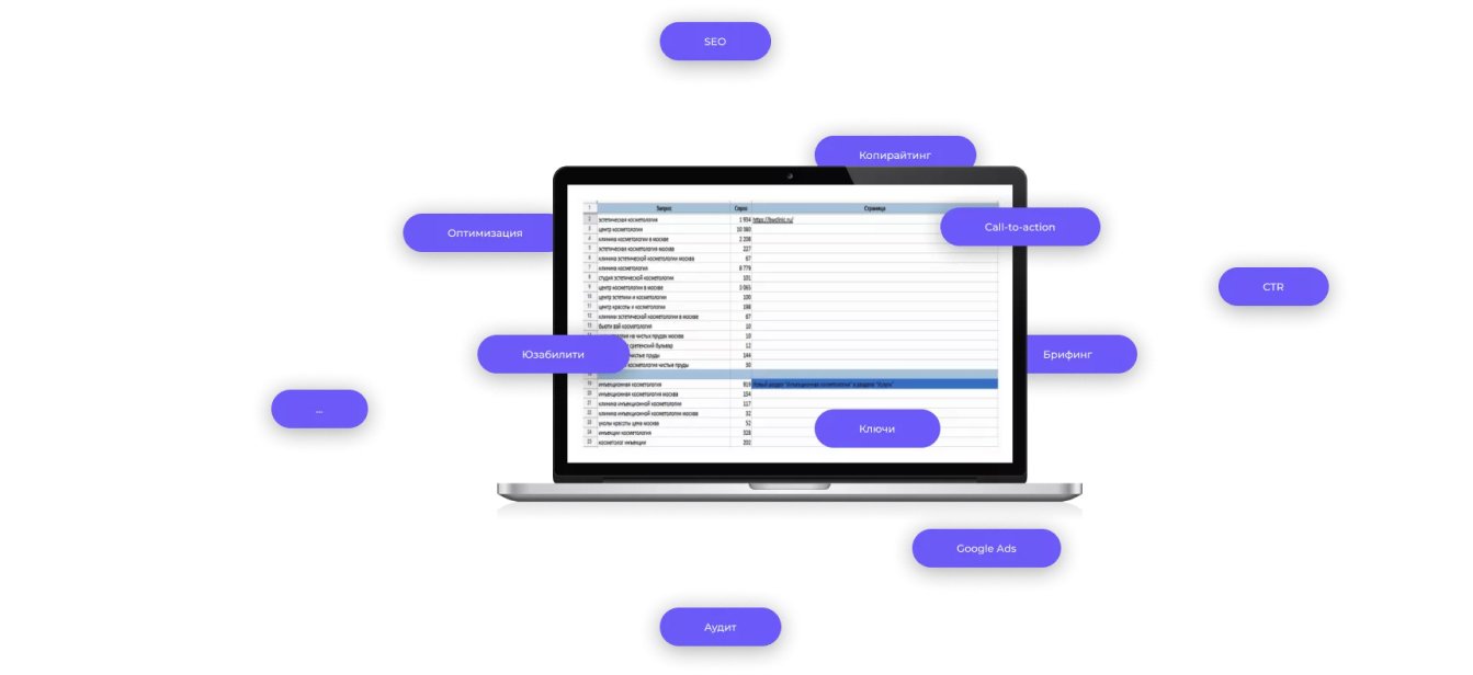 Этап подразумевает подборку высокочастотных, среднечастотных и низкочастотных ключевых слов, которые связаны с услугами компании и ищутся пользователями в поисковиках. В итоге было собрано порядка 1700 самых частых запросов. А затем проведена кластеризация — мы объединили похожие запросы в группы. Из них был сделан акцент на ключи с упоминанием наиболее востребованных услуг и те, что имеют указание на город и район Москвы, то есть соотносятся с территориальным расположением клиники.