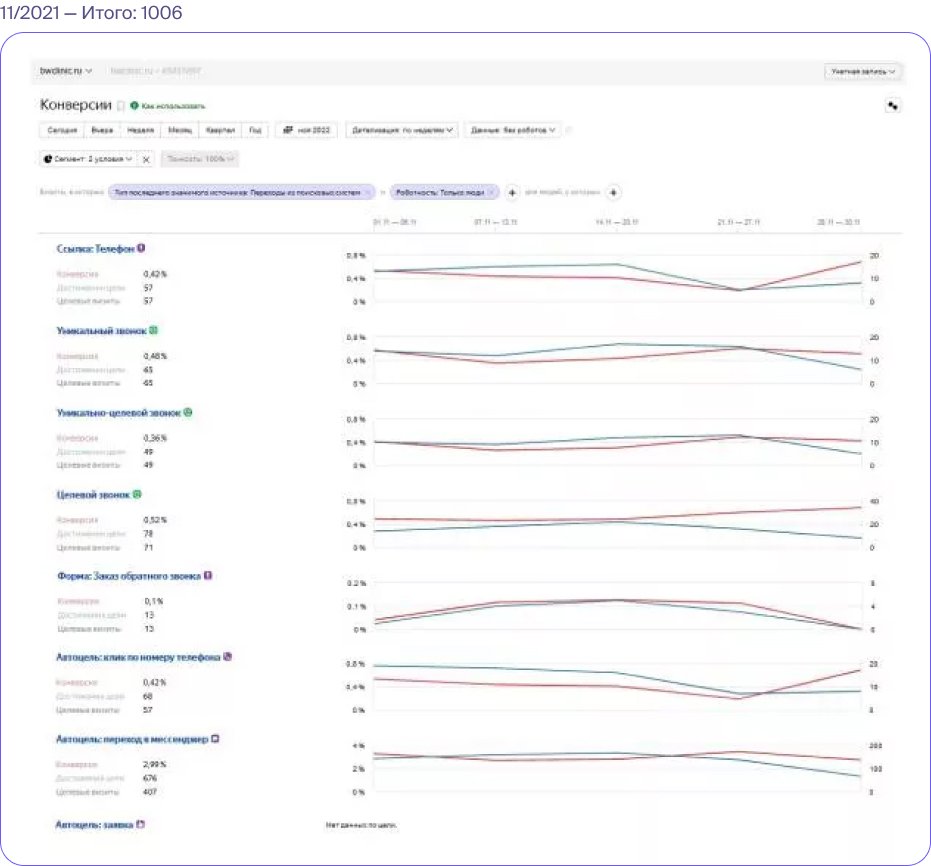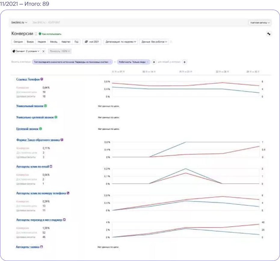 Конверсия позволяет оценить эффективность проделанной работы. Определяется как отношение общего числа посетителей сайта к количеству пользователей, которые совершили целевое действие. Повышение показателей указывает на увеличение интереса посетителей и готовность к взаимодействию — оставить заявку на обратный звонок, записаться на процедуру, связаться в мессенджере и т. д.