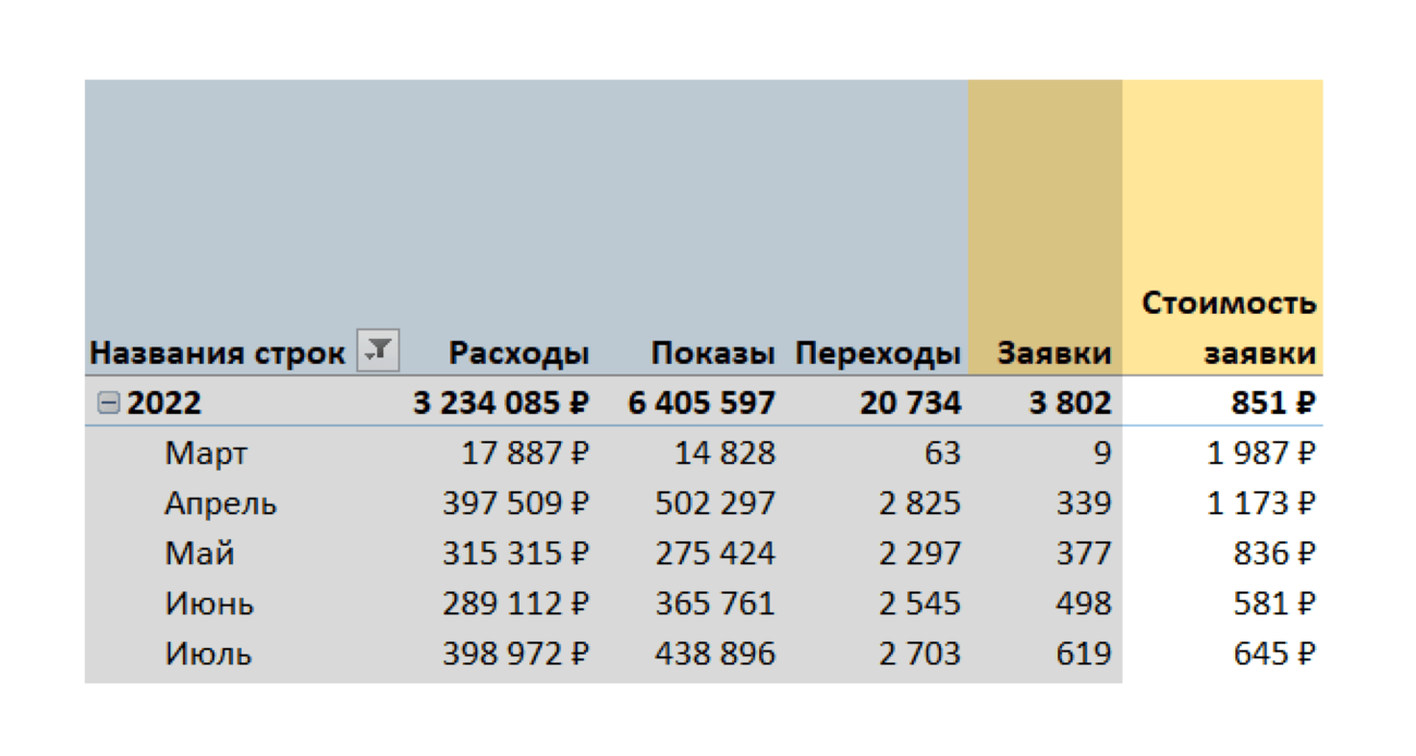 В колонках «Целевые заявки» и «Конверсия заявка → целевая заявка» видно, как увеличилось количество квалифицированных заявок и улучшалась конверсия