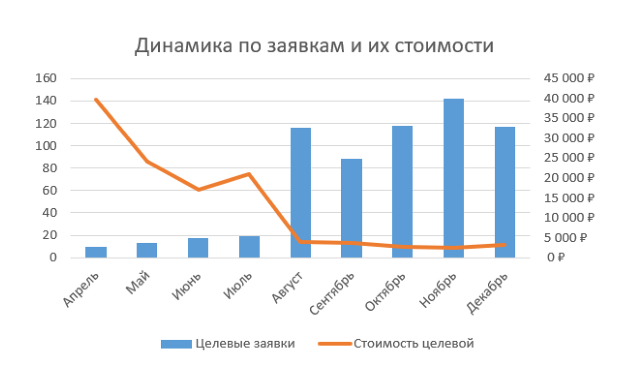 На скриншоте показано, что в августе начался рост числа целевых заявок, при этом стоимость заявки снизилась и потом оставалась стабильной до конца года