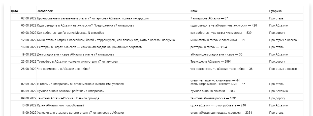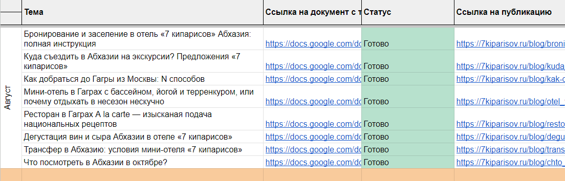 Для ряда статей пригодился наш опыт отдыха в Абхазии: впечатления, фото, важная информация, которую не нагуглить, — всё пригодилось для блога «7 кипарисов». Статусы по каждой задаче ежедневно отражались в таблице проекта. Все участники видели, на каком этапе работа сейчас, чего не хватает для создания контента, какие материалы требуют утверждения и т. д.