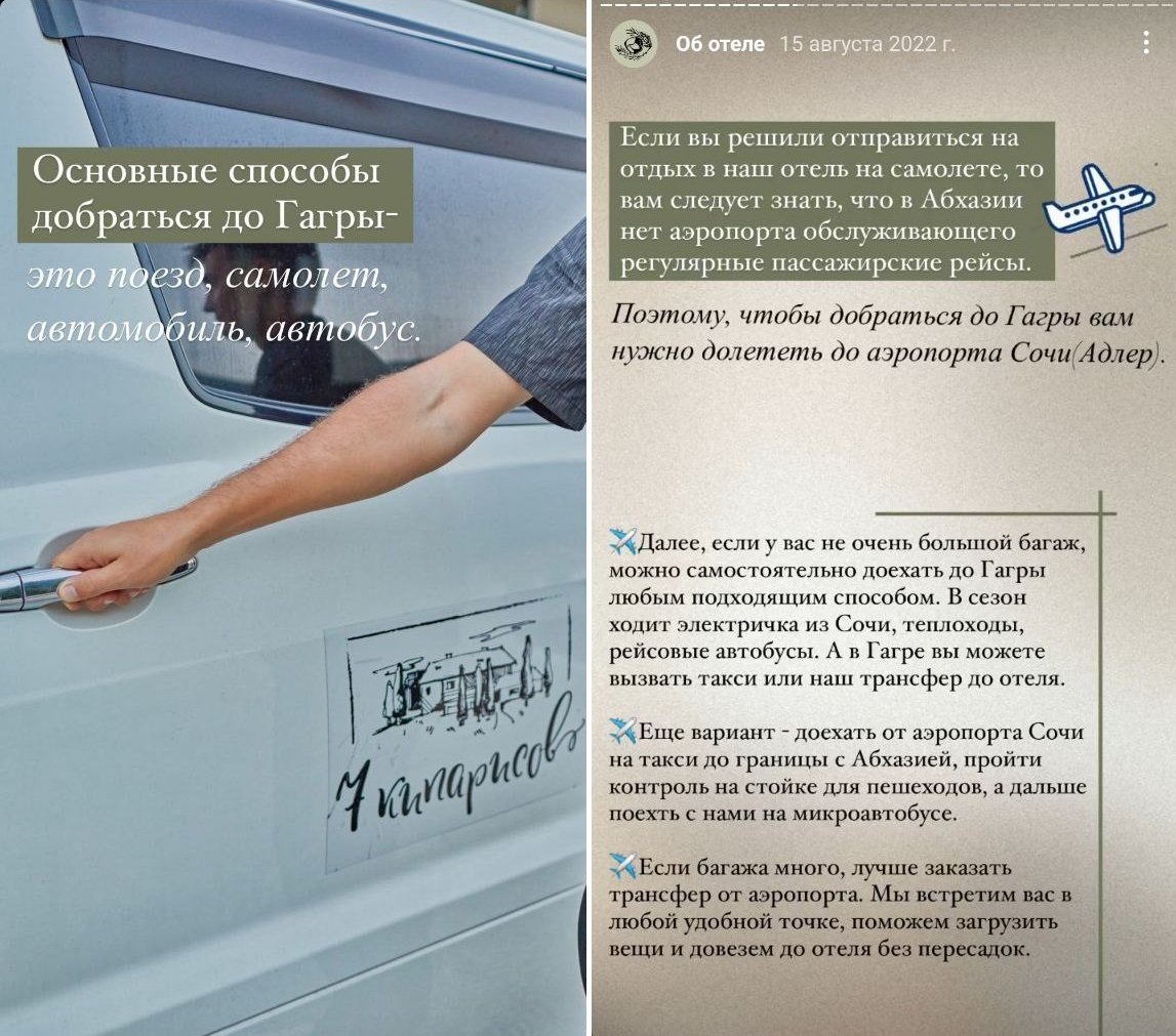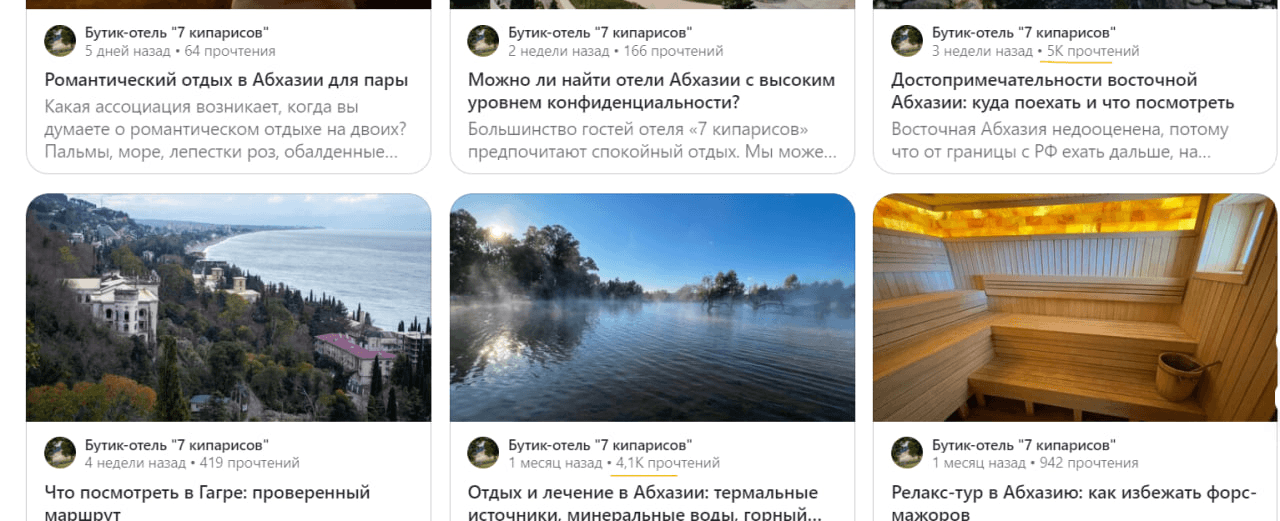 На консультации мы предложили не генерировать контент с нуля, не раздувать бюджет на продвижение, а дробить уже готовые статьи на смысловые кусочки и крепить к ним фото отеля и окрестностей. Из одной большой статьи таким образом получается не один пост, а несколько. Например, так: