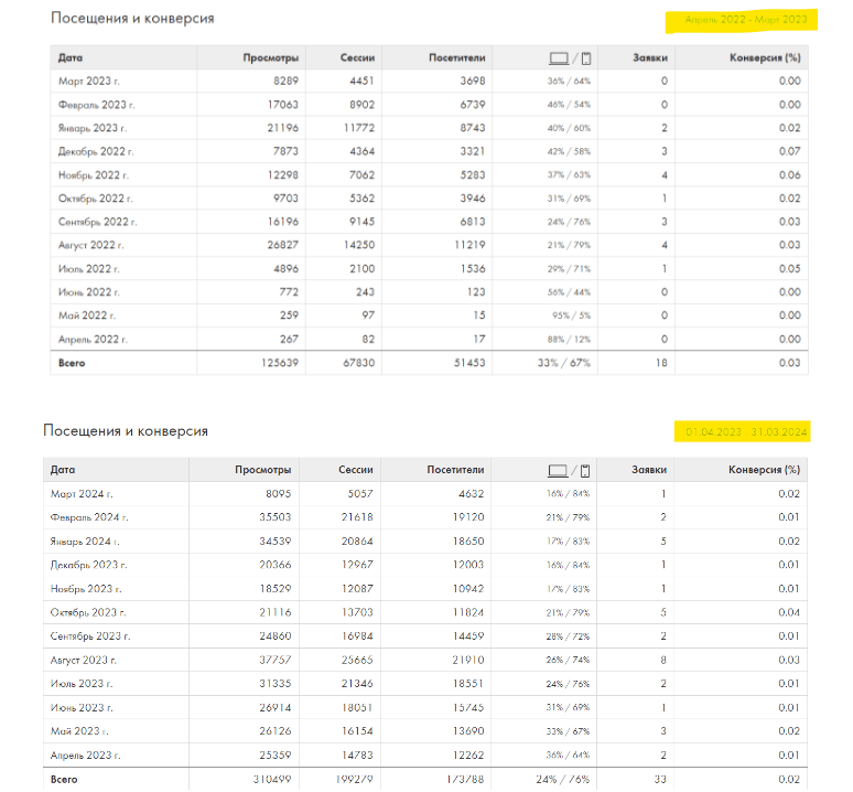 1. Вечнозелёные статьи, написанные в 2022 и 2023 годах продолжают вести трафик на сайт и приводить клиентов. Визиты, просмотры, заявки — за год выросли чуть вдвое, а кое-где — втрое.