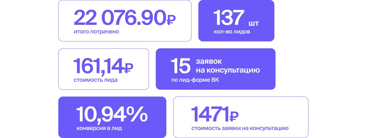 ● Заявки на консультацию по лид форме ВК: 15 шт.