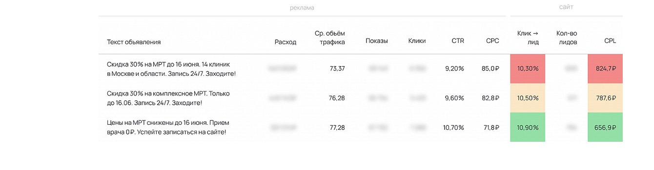 Мы стараемся найти объявление, на которое будут чаще кликать. Его рейтинг будет расти, а стоимость клика падать. Так мы снижаем стоимость лида и пациента.