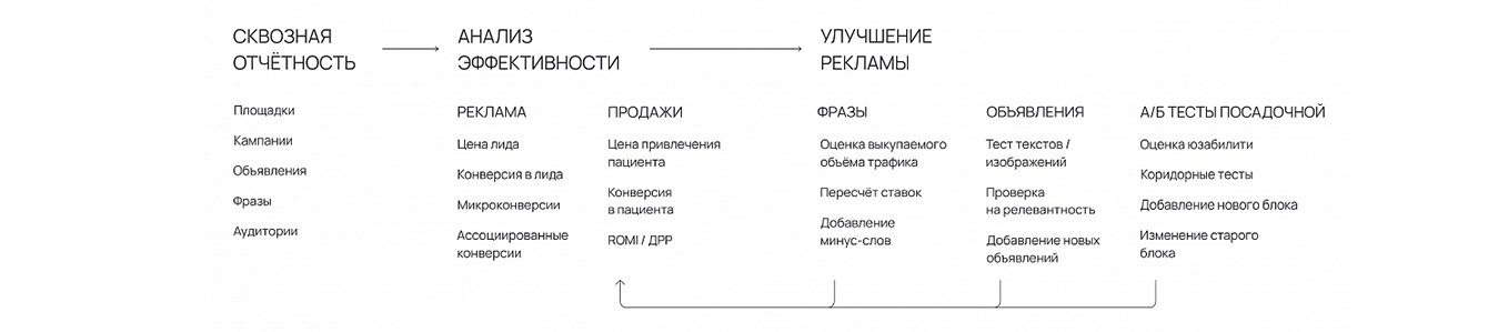 Сделать это быстро и без ущерба для бизнеса было невозможно. Если в один момент увеличить трафик, ДРР снизится, а стоимость привлечения пациента будет невыгодной. Если быстро снизить стоимость трафика, просядет общее количество пациентов и клиники будут простаивать. Нам нужно было построить системную работу, которая бы постепенно улучшала показатели рекламы до новых KPI.
