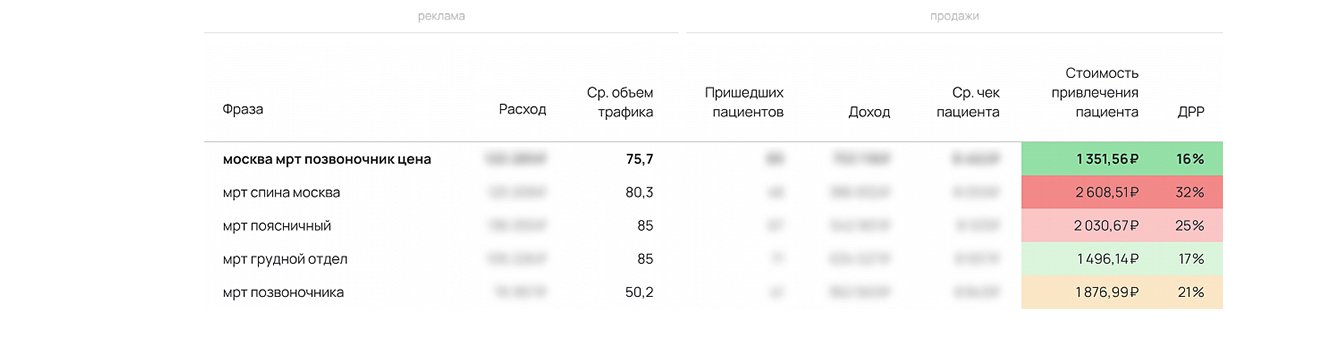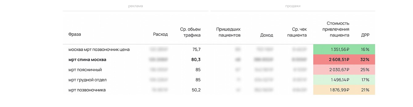 У ключевого слова «мрт спина москва» слишком высокая стоимость привлечения пациентов и высокий ДРР (цифры на скриншоте здесь и далее условные). Это кандидат на аудит или снижение ставки.