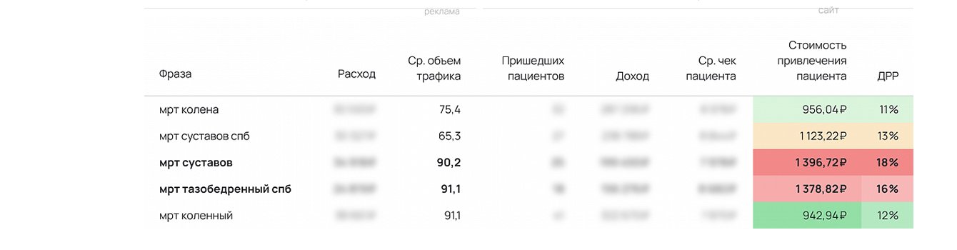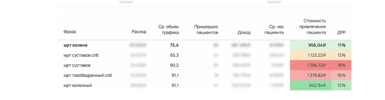 По ключевому слову «мрт колена» низкая стоимость привлечения пациентов и низкий ДРР. Запас по объёму трафика есть. Можно поднимать ставки и покупать больше трафика.