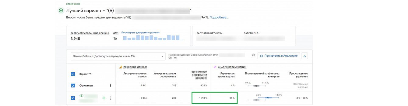 Google Optimize. Делаем тест в этом сервисе, если нам достаточно данных по конверсии в лида или по микроконверсии. Результаты А/Б-теста можно сразу посмотреть в кабинете сервиса.