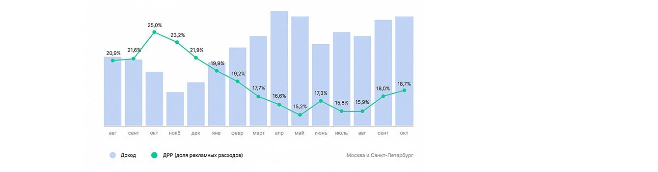 Средний доход в месяц увеличился на 21,9 %. ДРР снизился: 20,8 % → 17,1 %.