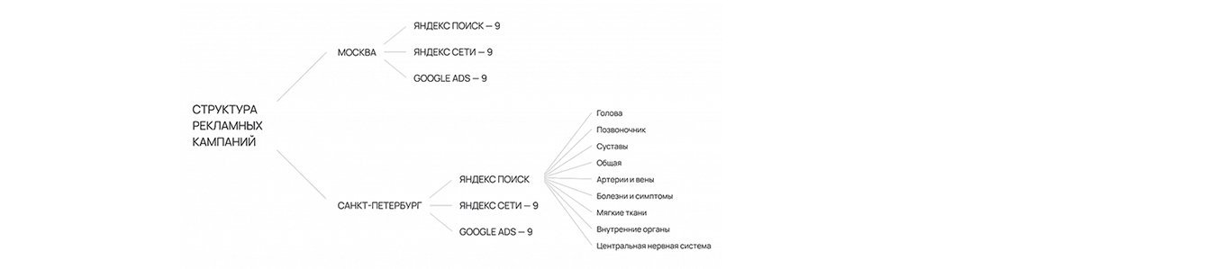 Всего мы ведём 54 рекламные кампании для МРТ. Они разделяются по областям сканирования, плюс к ним добавлены кампании с гео-запросами (например, «мрт на петроградской») и общими запросами (например, «сделать мрт»).