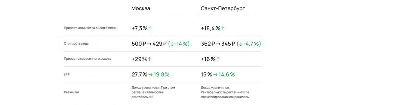 Снижение стоимости лида случилось за счёт пересчёта ставок, А/Б-тестов и постоянного тестирования объявлений.