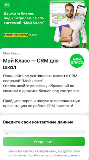 В качестве оффера мы использовали предложение об индивидуальной презентации работы в CRM-системе. Пользователь заполнял контактные данные, а затем отдел продаж связывался с ним и показывал индивидуальную презентацию. Также после формы пользователь мог перейти на сайт и ознакомиться с продуктом подробнее.
