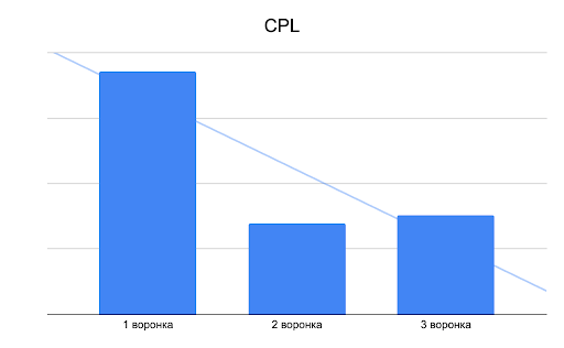 CPL снизили почти в 2 раза. Общий CPL первой воронки — 4976 ₽, с лид формами получили лиды по 2763 ₽. Длинная воронка давала хороший объем заявок по приемлемой цене, но со временем тоже начала выгорать и дорожать.