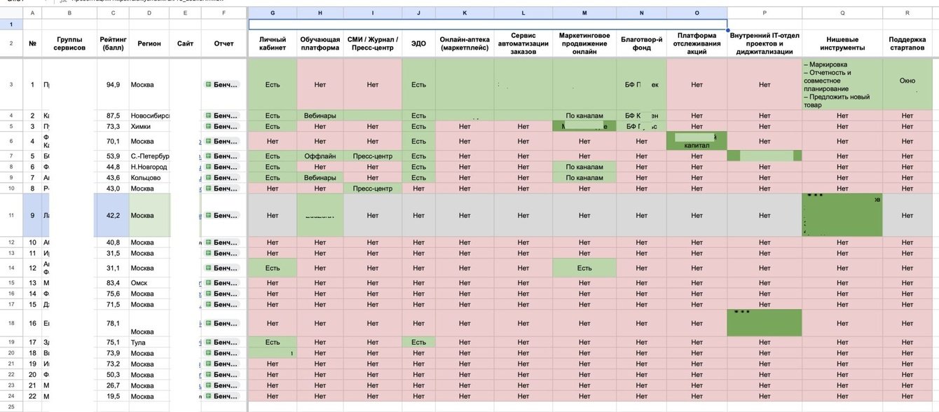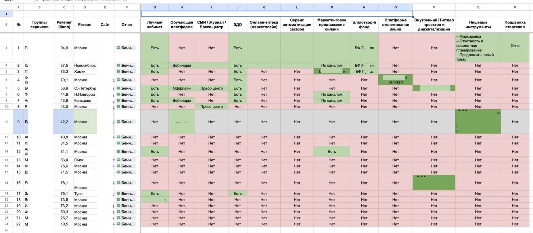 ✓ Создана таблица, где ключевые функции сервисов (электронный документооборот, образовательные платформы, маркетинговые инструменты) сравнивались между конкурентами.