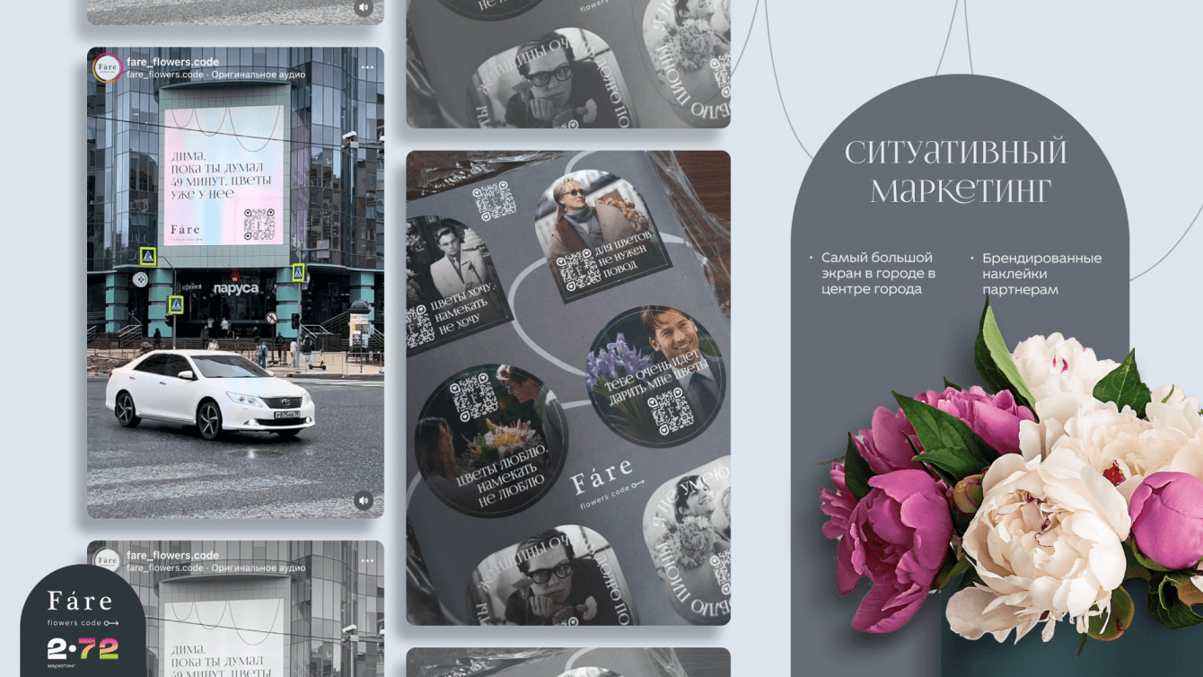 Кроме того, мы реализовали кросс-маркетинг, с «Атмосферой» — одним из самых популярных баров-ресторанов Тюмени. В этом сотрудничестве мы активно проводили совместные съемки, делали публикации, изготавливали наклейки и открытки для бара с брендингом для доставки цветов и для гостей этого заведения. А также подготовили скрипты для официантов и менеджеров. Чтобы во время бронирования столов гости получали информацию о Fáre.