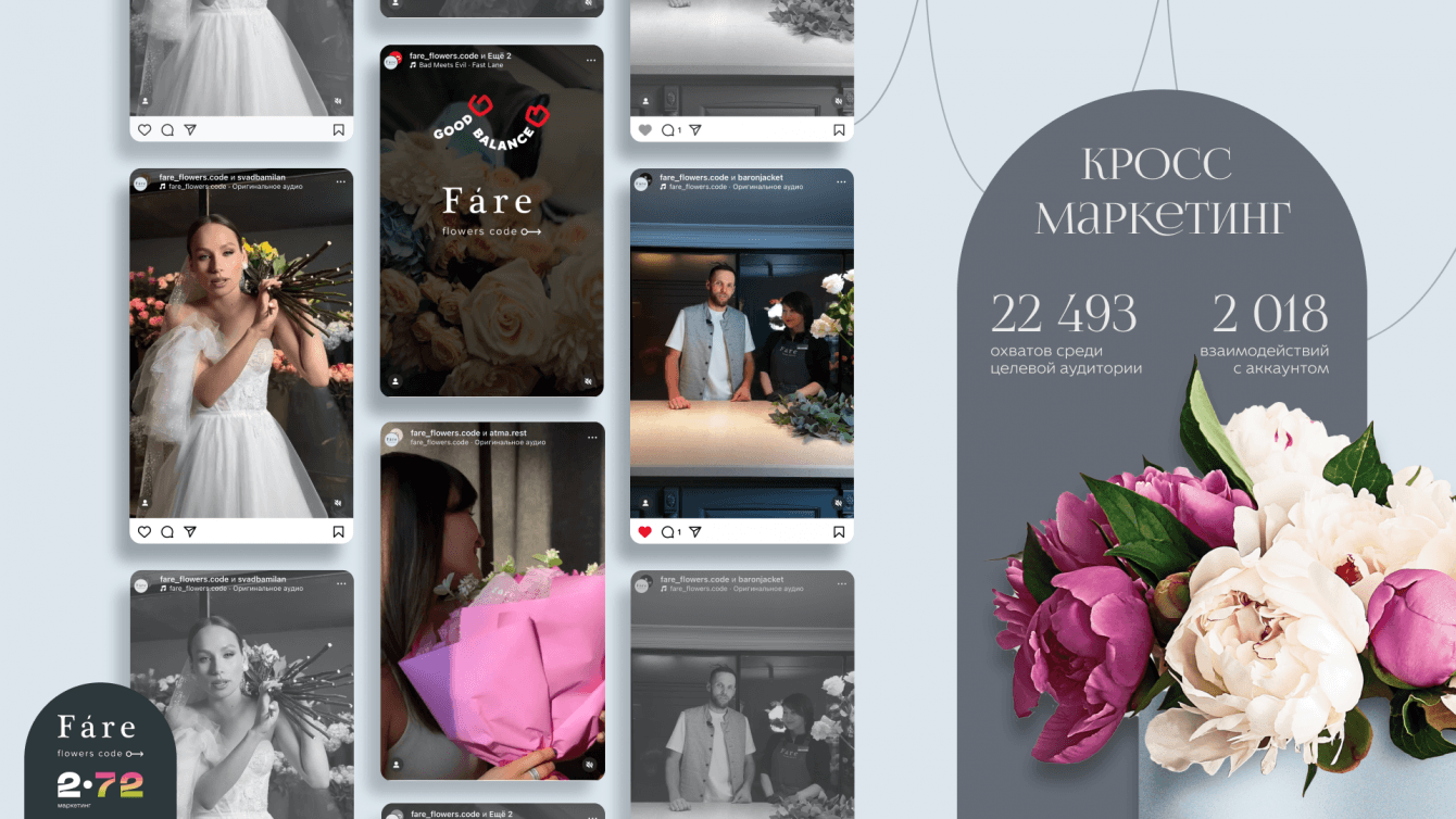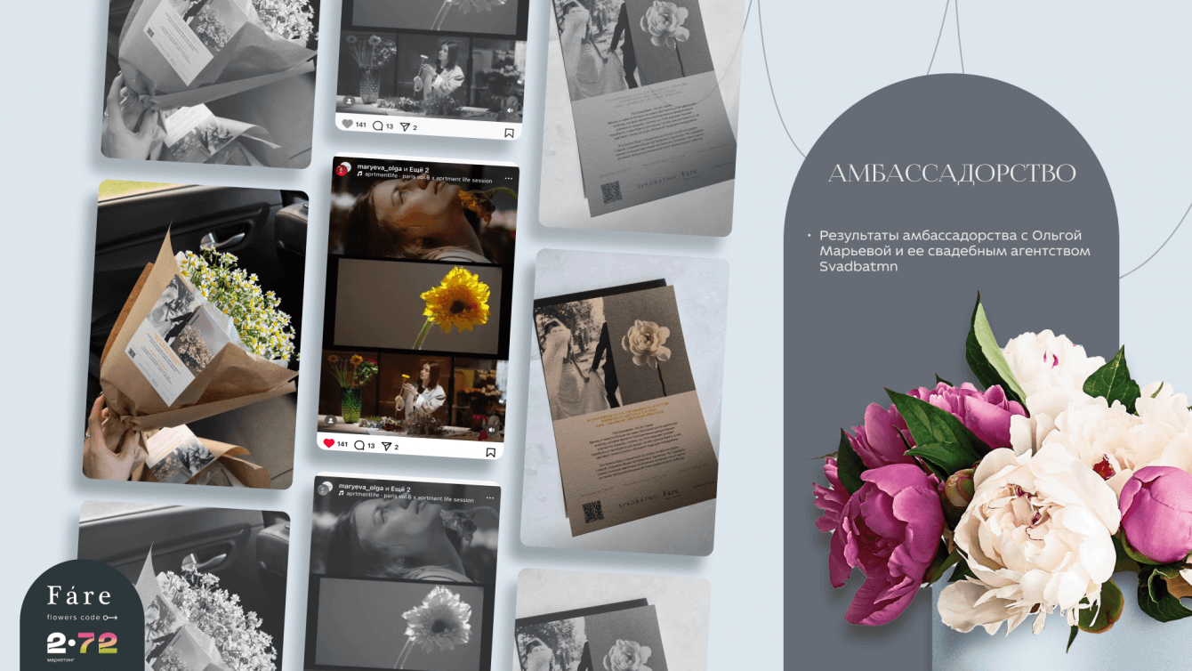 - создавали совместные коллаборации с инфлюенсерами. Например, в День ромашек, отправили семи блоггерам чудесные букеты с индивидуальными открытками, правилами гадания на ромашках и совместным брендингом - Fáre х SVADBATMN.