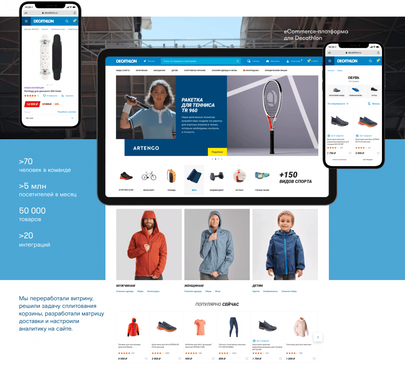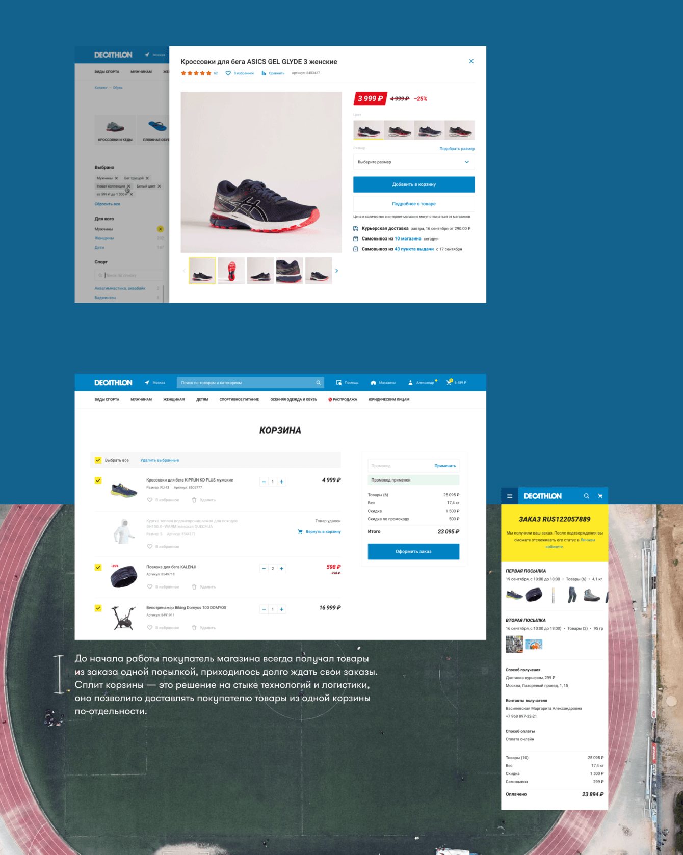 На Decathlon мы, в числе прочих, решали задачу сплитования корзины — чтобы в будущем имплементировать ее на маркетплейс-модель. Сплит корзины — это решение на стыке технологий и логистики, оно позволило доставлять покупателю товары из одной корзины по-отдельности. Это напрямую влияет на лояльность.