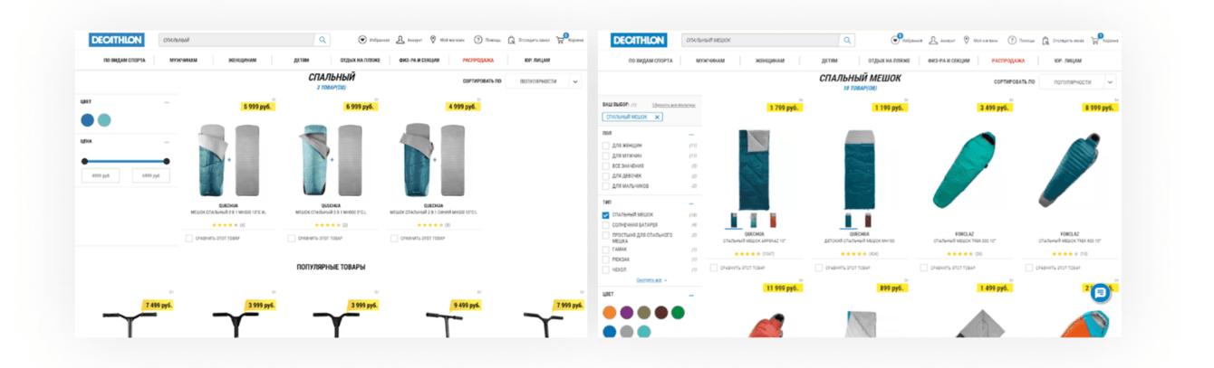 При работе над магазином Decathlon мы провели качественные и количественные исследования, в том числе опросы респондентов из разных целевых сегментов клиента. После глубинных интервью мы проводили UX-тест: давали респондентам задания, которые соответствуют их обычному поведению на сайте, исходя из их потребностей. Например, тем, кто увлекается сноубордом, предлагали поискать элементы экипировки. Для проведения UX-теста все респонденты делились на 2 группы: половина тестировала десктопную версию сайта Decathlon, половина — мобильную.
