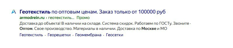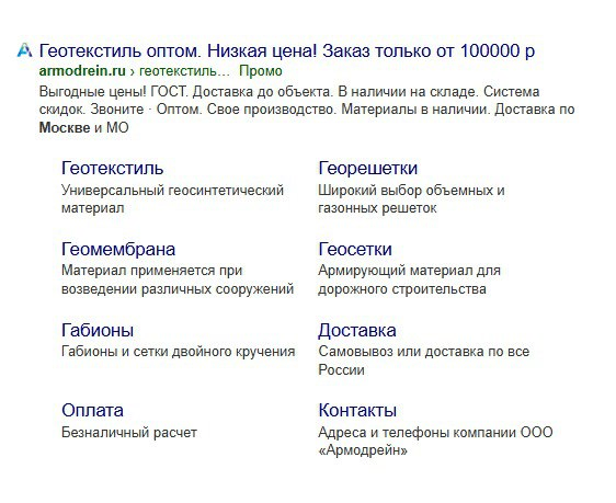 Такой формат мы выбрали, потому что он закрывает сразу две задачи: расширяет семантику (ловит даже те запросы, которые трудно предугадать) и визуально выделяет компанию в выдаче.