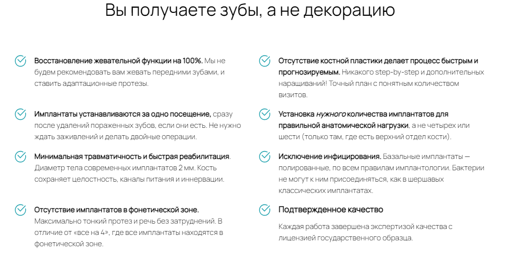 Если вам покажут две одинаковые тарелки, но одна будет стоит в 2 раза меньше, вы, вероятно, выберете ту, что стоит дешевле. Ведь зачем платить больше? Так и есть, когда люди видят рекламу имплантации зубов. Поэтому главной задачей стало раскрыть ценность продукта и его принципиальное отличие от конкурентов. Когда мы видим пользу и выгоду, мы готовы заплатить чуть больше, но получить оптимальный вариант.