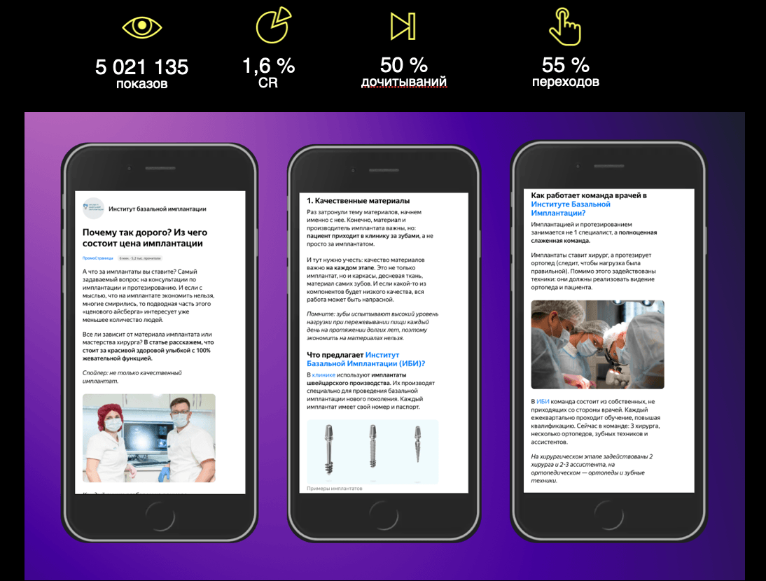 Мы решили протестировать инструмент. Нам удалось охватить новую аудиторию, рассказать о базальной имплантации и ее отличии от других методов в связке с центром, тем самым повышая его авторитет и укрепляя бренд. Глубоко проработанные статьи вместе с экспертами клиники позволили значительно увеличить трафик и количество заявок на консультацию.