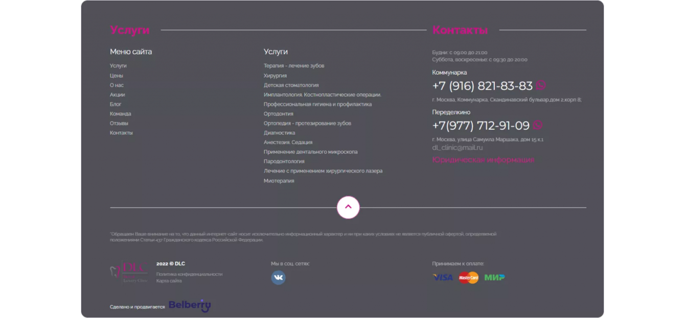 Таким образом, страница не выглядит перегруженной, при этом на ней есть контент, необходимый для поискового продвижения и коммуникации с потенциальными пациентами.