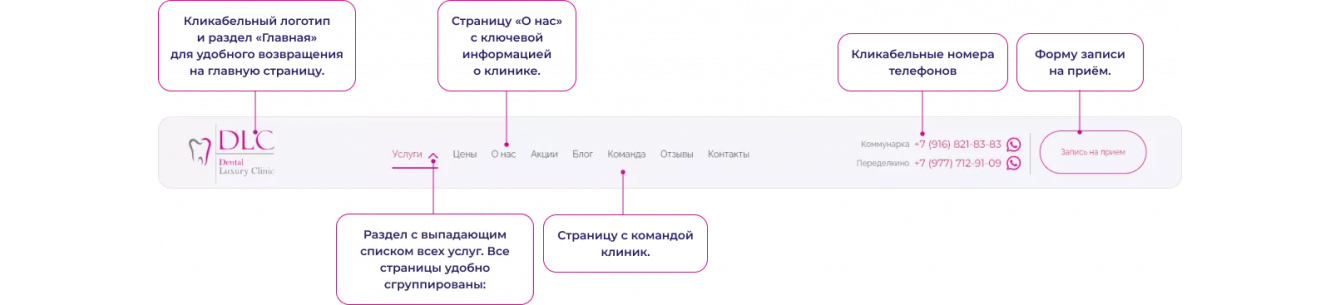 Когда пользователь заходит на сайт, ему нужно быстро сориентироваться в навигации. Если на главной странице ничего не понятно, потенциальный пациент уходит, не записавшись на приём.