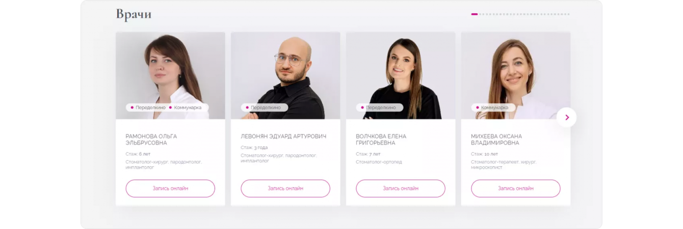 Для оформления персональных страниц стоматологов мы приезжали в клиники лично и проводили фотосессии, чтобы все специалисты были представлены на сайте в едином стиле.