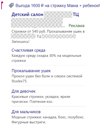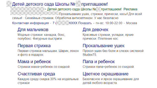 4.4. поисковую кампанию, настроенную на адреса детских садов и школ с радиусом 1 км на ручном управлении в повышенными ставками для охвата целевой аудитории (родители детей, которые регулярно бывают в детском саду или школе). Использовали следующий оффер:
