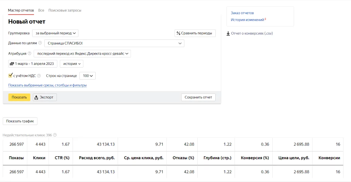 Количество конверсий, заявок (конверсии в данном отчете приравниваются к заявкам, так как, обратите внимание, при формировании отчета я выбрала цель: «Страница СПАСИБО!». На этом проекте на страницу СПАСИБО человек попадает, когда отправляет контактные данные в форме обратной связи.