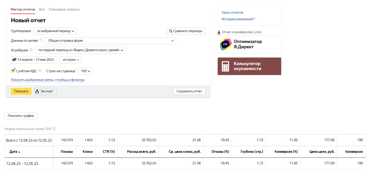 Теперь посмотрим на тот же самый отчет за месяц нашей работы. Период 12.04.2023-12.05.2023.
