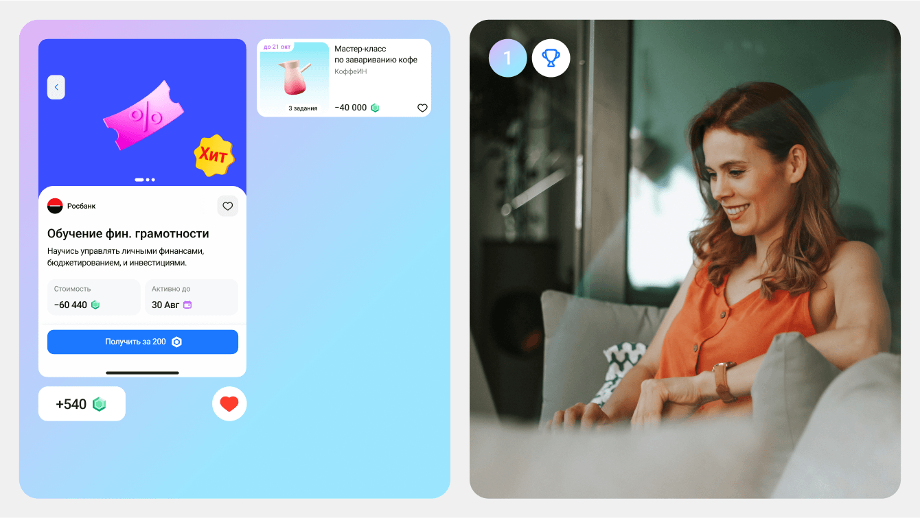 Добавили крупные виджеты с балансом, картой достижений, рейтингом и наградами, чтобы показать все возможности приложения. Под ними разместили блок с баннерами, которые призывают выполнить определённые задания, пройти тест или игру.