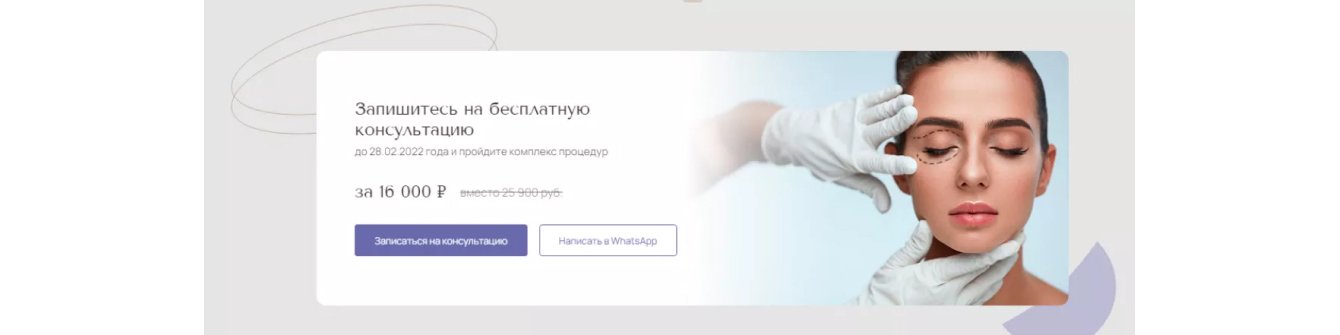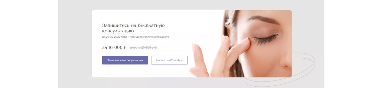 В медицинском маркетинге есть несколько поводов использовать бесплатные консультации в воронке. Два из них: продвижение новой услуги и консультация перед сложной малознакомой процедурой. Это именно наш случай, поэтому мы делаем акцент на бесплатной консультации с врачом в нескольких местах лендинга.