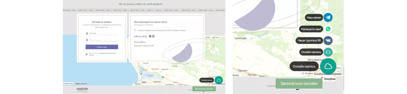 В футере указаны контакты клиники и открытая форма обратной связи. Также здесь закреплен движок для быстрой онлайн-записи или выбора других площадок коммуникации с менеджерами без звонков. Все формы обратной связи интегрированы с CRM, поэтому владелец медбизнеса всегда знает, что: