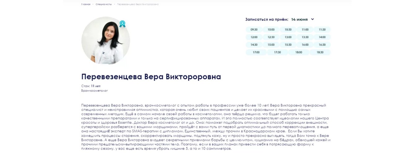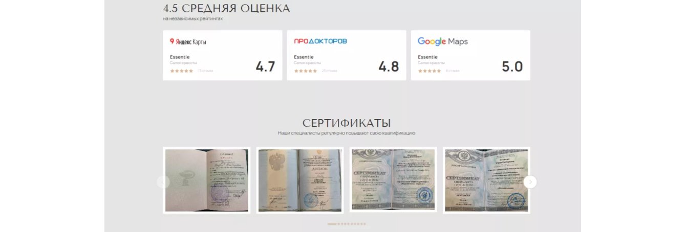 Также на этой странице размещены подробная информация об образовании специалиста, дипломы и сертификаты, отзывы о враче и примеры работ. Каждый из этих критериев важен для конверсии.