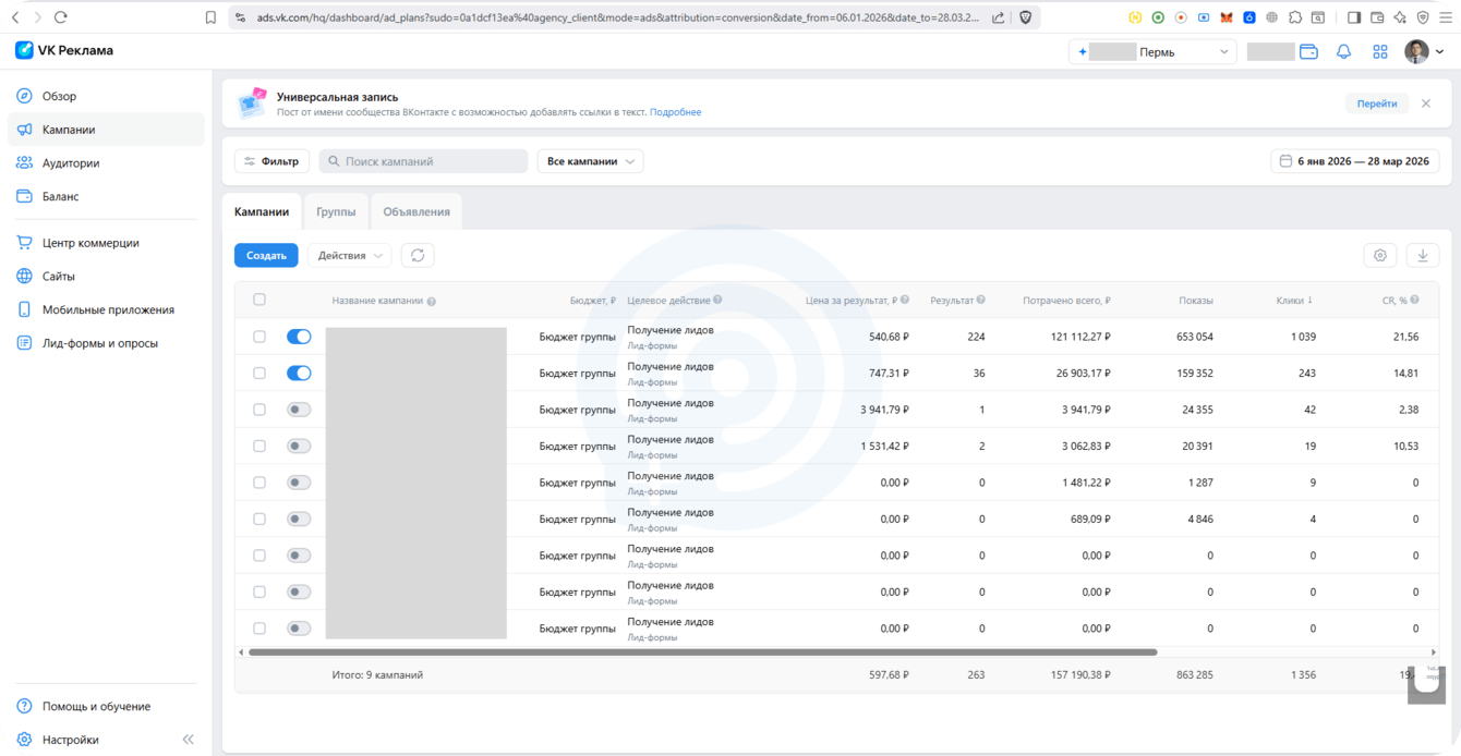 Клиент — «Этажи Пермь» — на момент старта квартала уже использовал Директ, Авито и агрегаторы, но сомневался в целесообразности регулярных вложений в VK. Задача: за 3 месяца получить прогнозируемый поток заявок с прозрачной стоимостью лида и высоким качеством контактов (квалификация, долгосрочный контакт, выход на сделку).