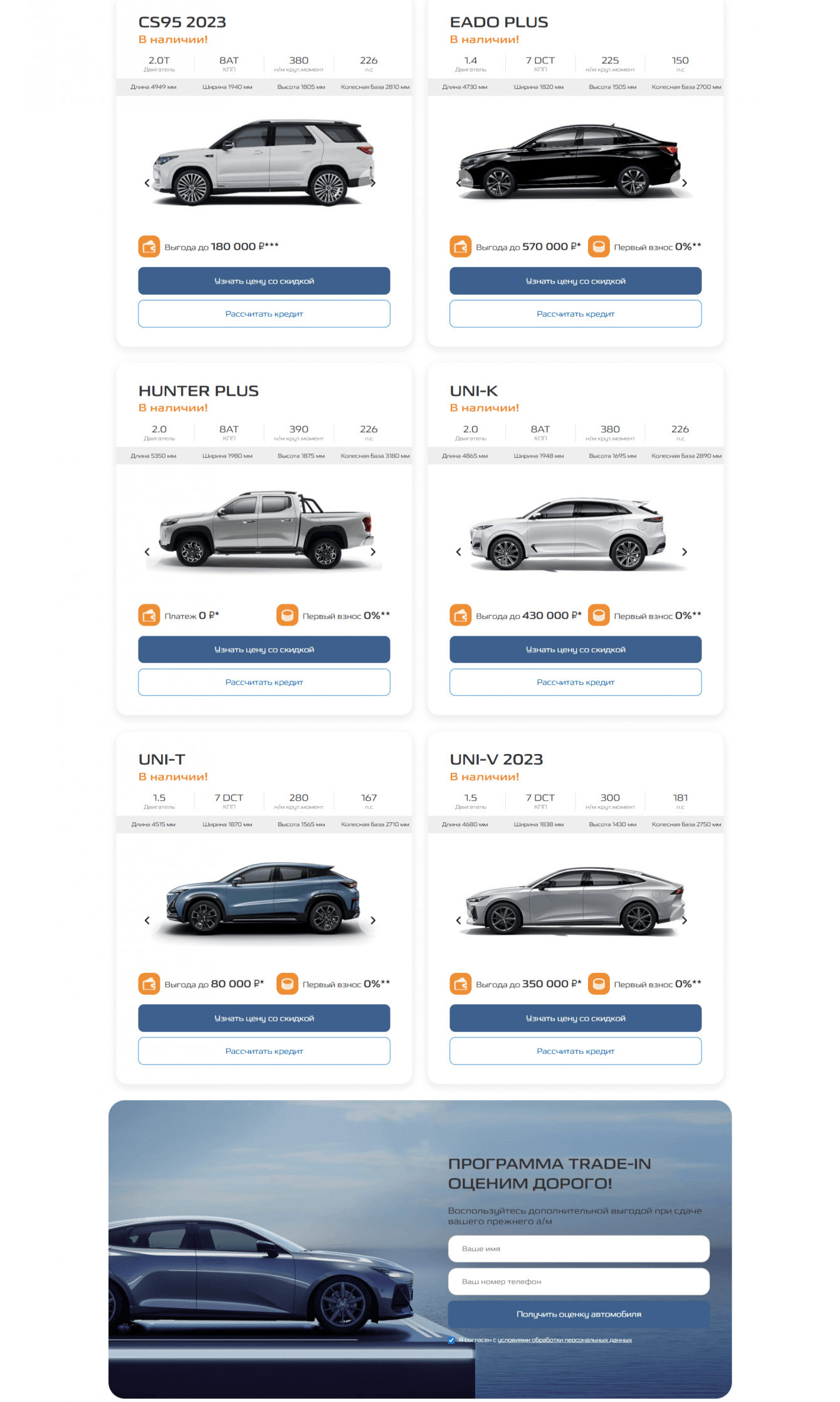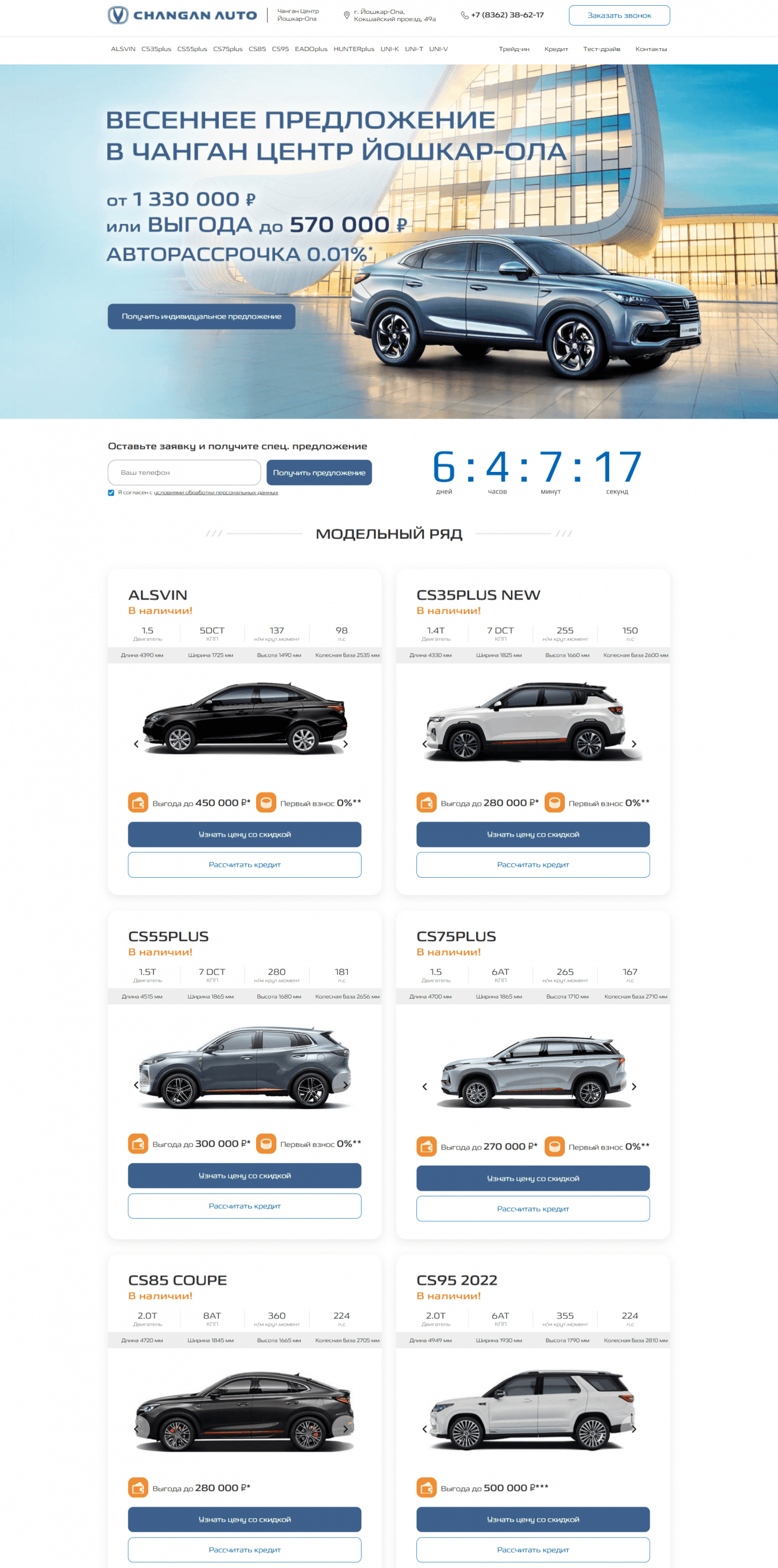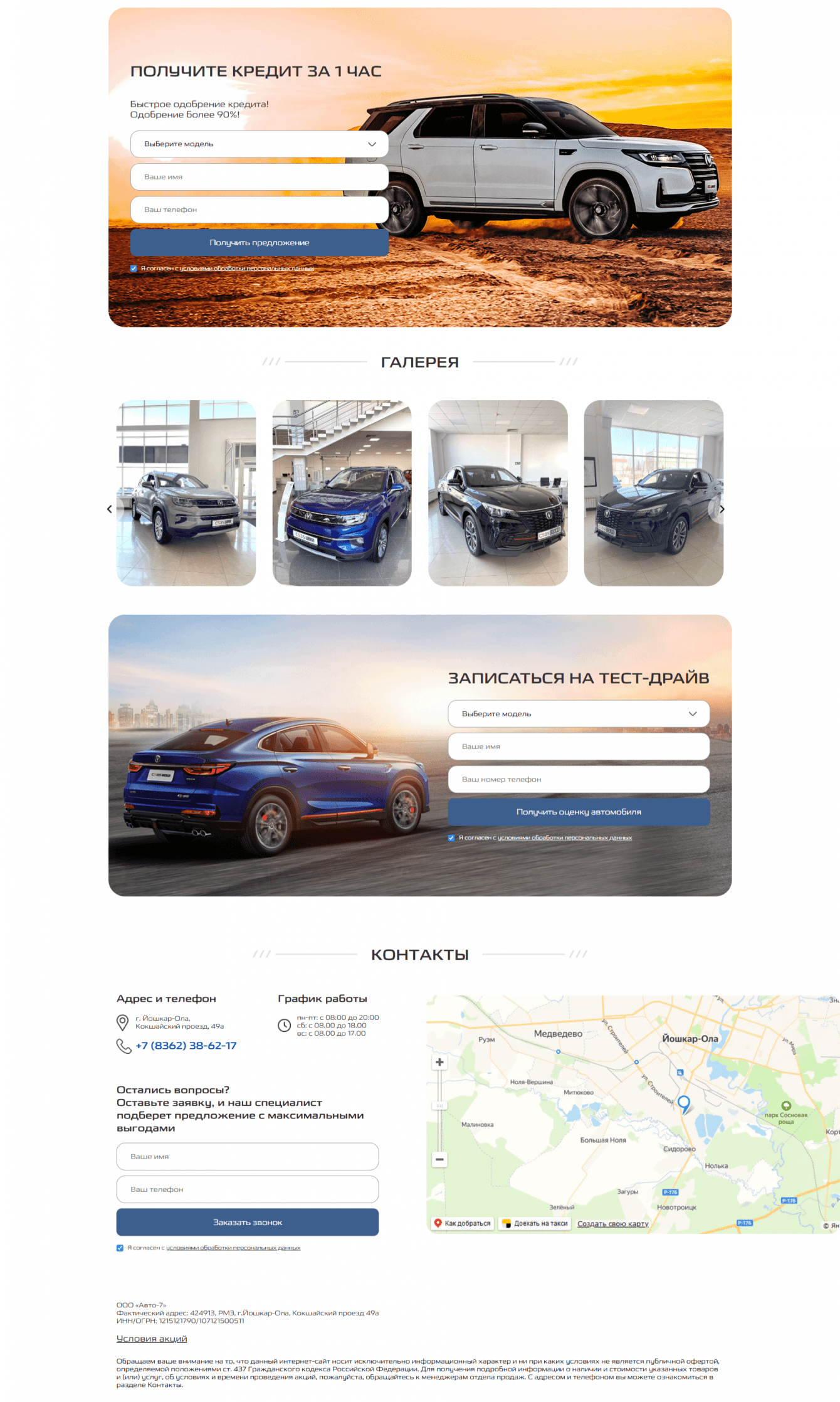 В ходе проведения первичной аналитики, основываясь на опыте работы с автодилерами, мы пришли ко мнению, что дилерский сайт не будет приносить лиды в том количестве, в котором нам нужно. Поэтому первоначальная задача – собрать клиенту конверсионный лэндинг. Мы продумали концепцию, разработали структуру, собрали наполнение, сверстали. И продающая посадочная страница готова. А дальше, подключение коллтрекинга и стандартный сбор кампаний: Поиск, РСЯ, МК, ретаргетинг.