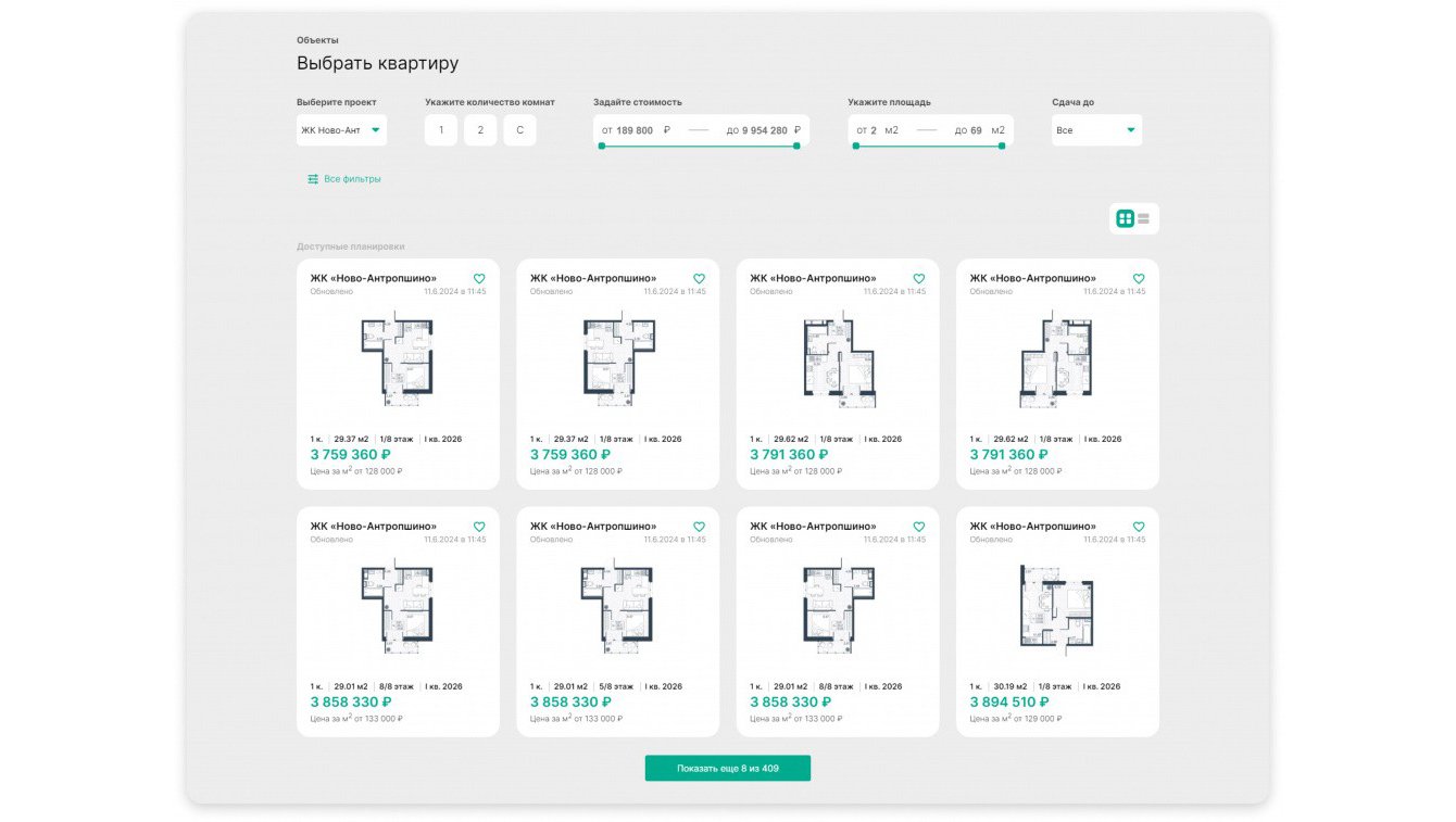 В первый MVP входили «Главная страница», раздел «Как купить», страница объекта «Ново-Антропшино» и общая страница всех реализованных объектов застройщика с возможностью выбора квартиры.