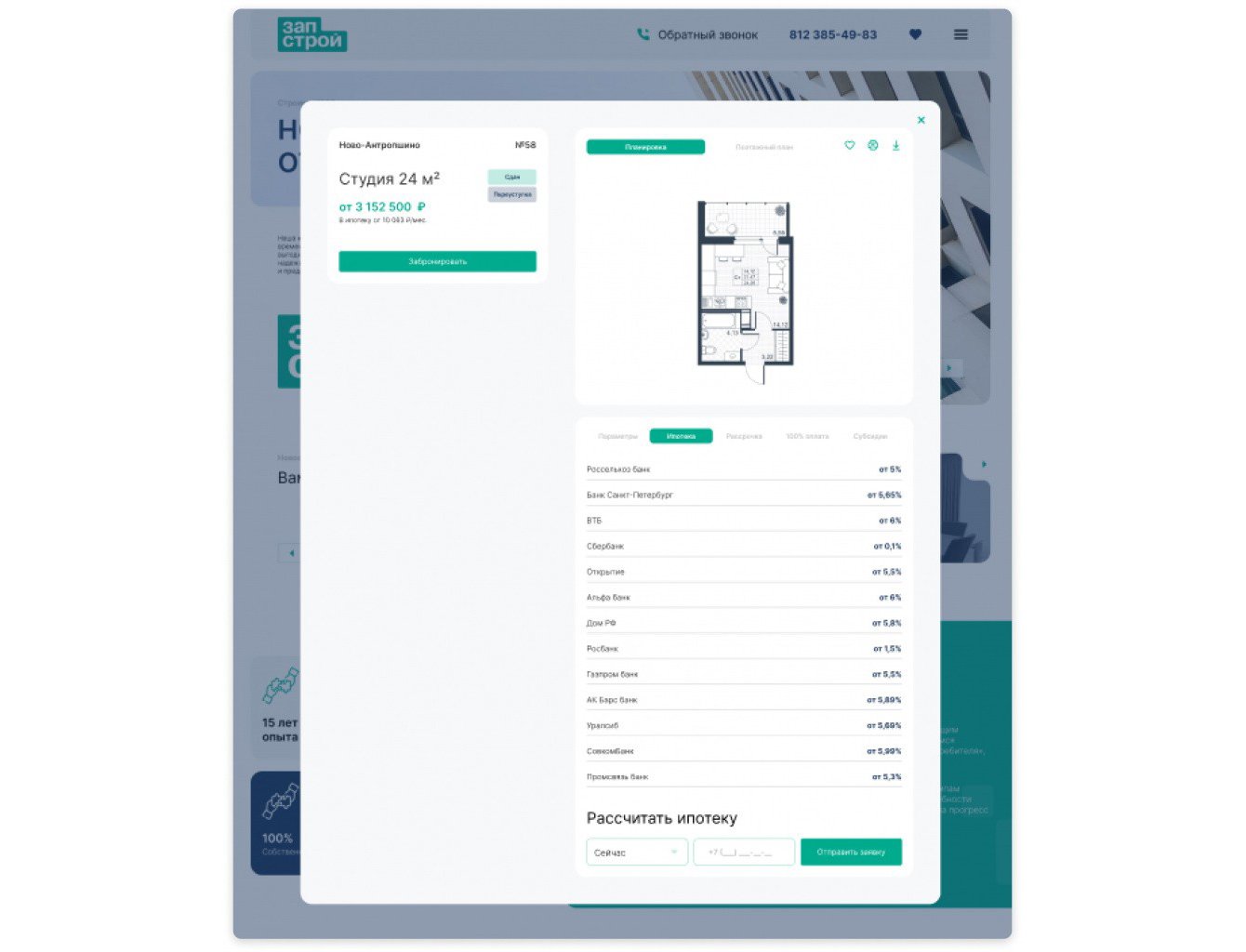 Клиент активно участвовал в процессе дизайна, предлагал референсы и решения со своей стороны. Основная сложность проекта на данном этапе заключалась в создании блоков выбора квартиры и калькулятора ипотеки на главной странице.