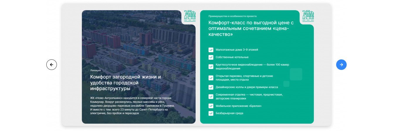 В первый MVP входили «Главная страница», раздел «Как купить», страница объекта «Ново-Антропшино» и общая страница всех реализованных объектов застройщика с возможностью выбора квартиры.