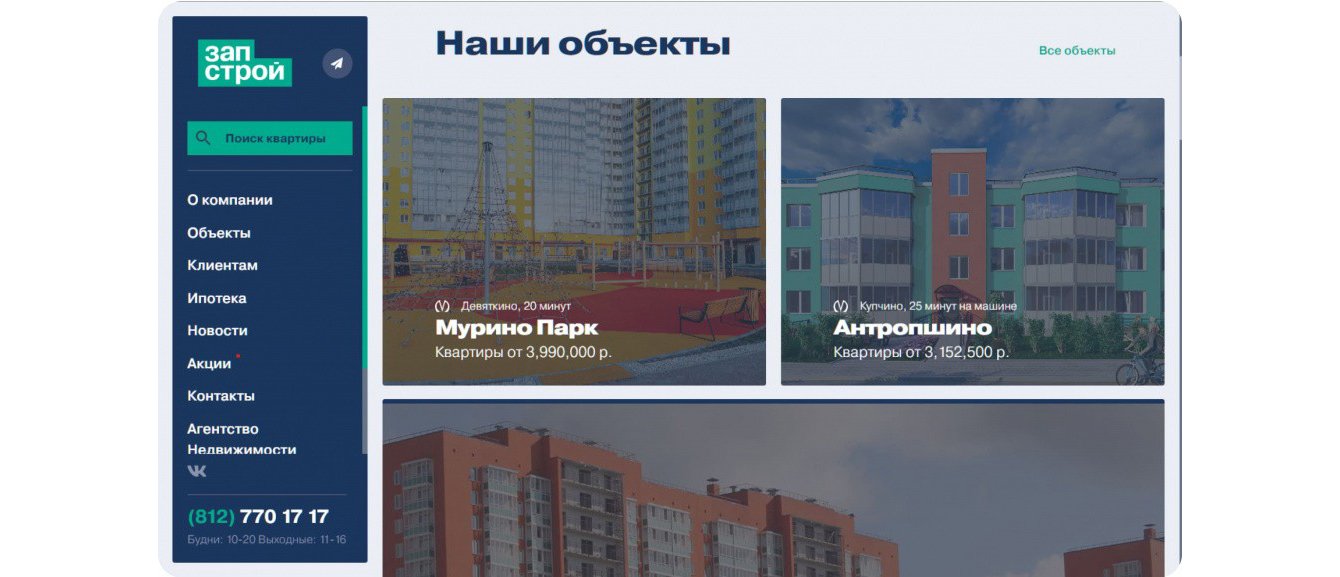 На странице о компании мы выделили, что «Запстрой» возводит качественные объекты с соблюдением всех норм и строго в срок, а также заботится о будущих жильцах с помощью технологических «фишек», например, использует комплексное решение «Брелок». Это система умного многоквартирного дома для жильцов и управляющей компании, где можно связаться с организацией, оплатить коммунальные услуги, контролировать видеонаблюдение.
