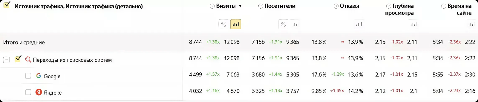 ● Предварительный аудит сайта. Мы проверили, насколько хорошо индексируется сайт в поисковых системах, собрали информацию из систем аналитики Яндекс.Метрика, Google Analytics;