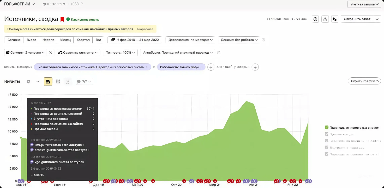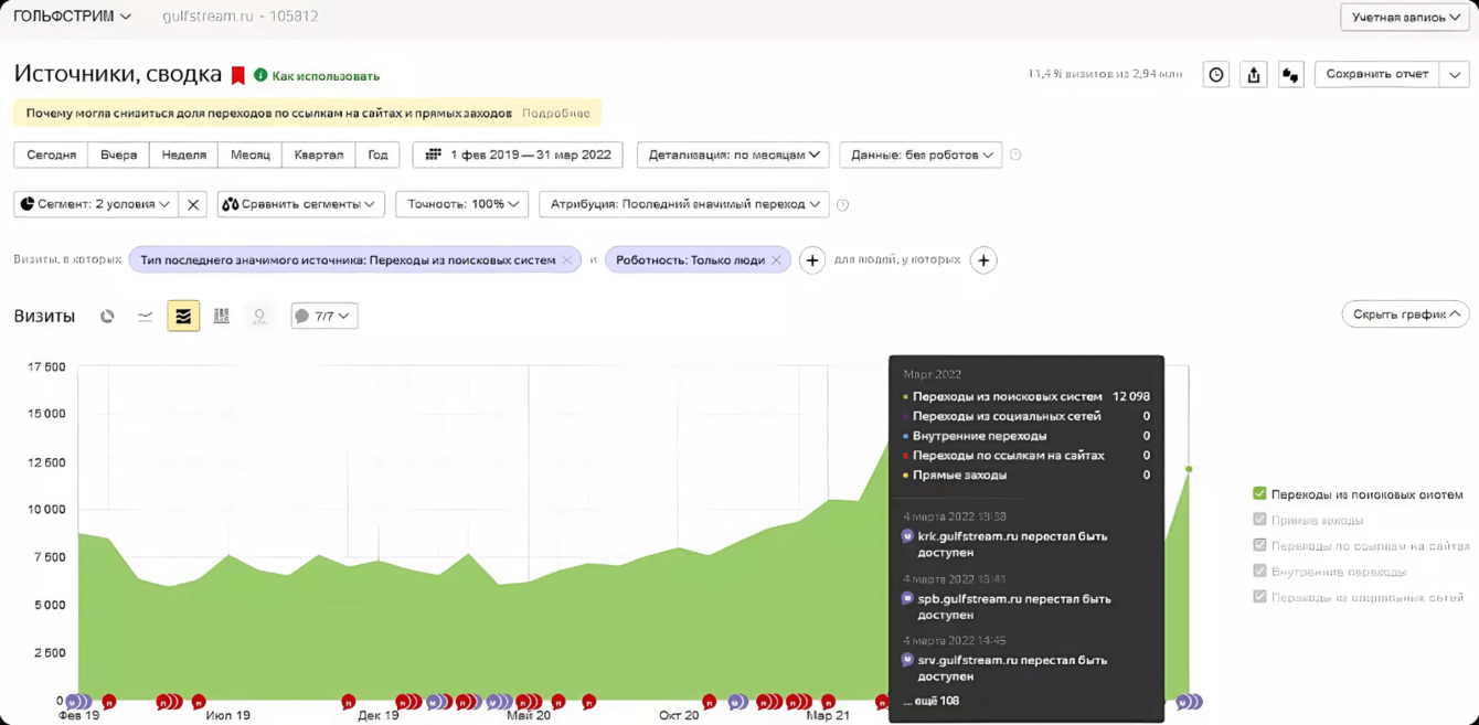 График показывает изменение количества переходов на сайт из поисковых систем в рабочий период с февраля 2019 по март 2022