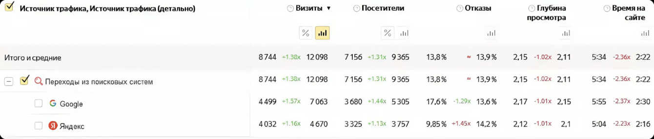 ● Конверсия — важный показатель, который отражает результативность переходов (отношение количества посетителей, совершивших целевое действие — звонок, заполнение формы обратной связи — к общему числу посетителей).