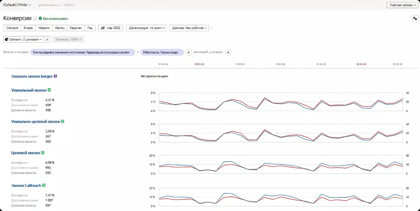 Как видно из приложенных графиков, по многим показателям на начальном этапе работ конверсий было недостаточно — 644. Ниже размещаем графики по конверсиям на конец марта 2022 года, чтобы была возможность провести сравнительный анализ.